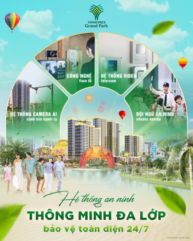 Với hệ thống an ninh đa lớp với ứng dụng công nghệ thông minh được thiết lập dày đặc từ ngoài vào trong, từ khu vực công cộng cho đến tận cửa từng căn hộ và được vận hành 24/7, Vinhomes Grand Park tự hào mang đến cho cư dân sự an tâm tuyệt đối để tận hưởng cuộc sống bình yên trọn vẹn nơi Đại đô thị Xanh – Thương mại Dịch vụ – Giải trí hàng đầu TP.HCM.