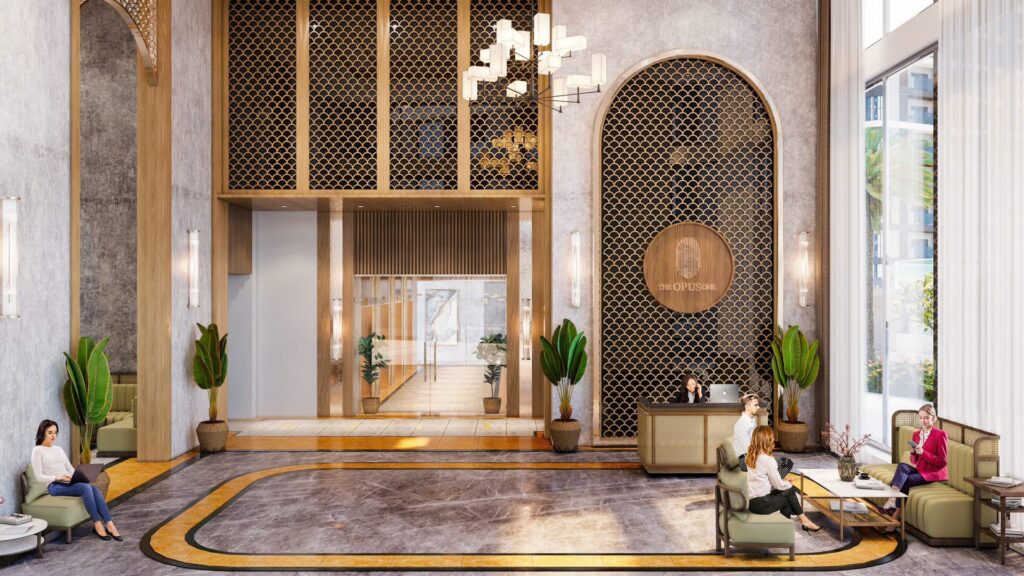 Ngay từ sảnh đón, The Opus One tái hiện trải nghiệm lounge thương gia với sofa êm ái, ánh đèn pha lê lấp lánh – “tấm vé First Class” đưa chủ nhân trở về nhà trong đẳng cấp:
